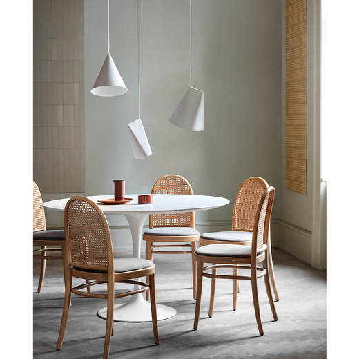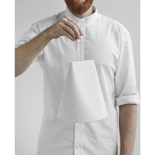 マットなテクスチャーのシェードは素焼きのセラミック。ひとつひとつ手作業のため、手作りならではの個体差を楽しめます。シェードとコードが固定されていないので、電球を左右に動かし角度を変えることで光の向きを調整できます。ベッドサイドでは単一で、ダイニングテーブルには いろいろと組み合わせて多灯吊りにするなど、空間に合わせてさまざまな表情を演出できます。