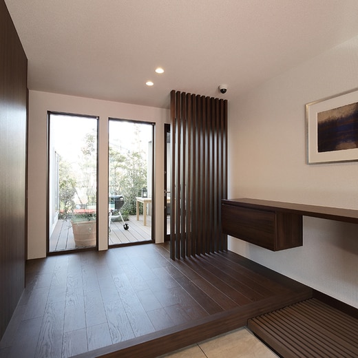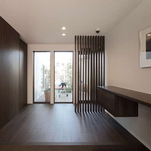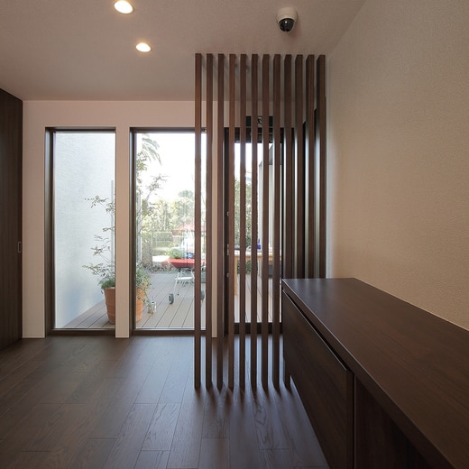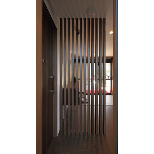 空間を緩やかに間仕切ることができる縦格子。1本ずつの単独取付タイプなので、設置場所や設置幅・間隔などに自由度があります。また、縦格子は長さを自由にカット可能で各天井高や間口に対応できます。