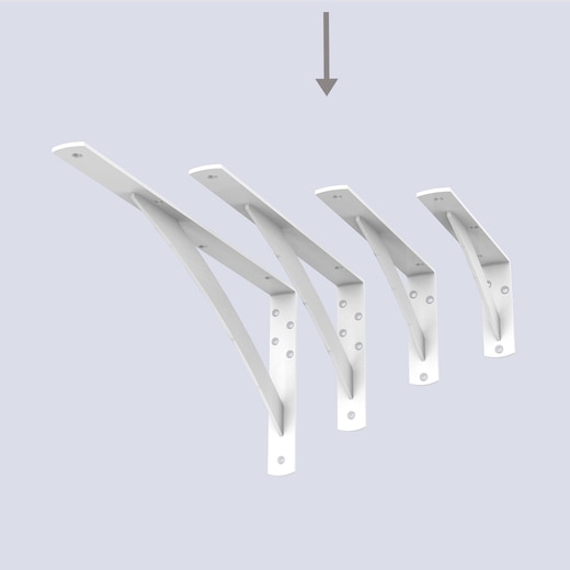 ゆるやかなRの補強がついたシンプルなブラケット。取付けの際は下地の強度、芯材の有無、天板の強度等に充分ご注意ください。ロングカウンターなど、ブラケットのピッチが900mm以上となる場合の補助ブラケットとしてご利用願います。