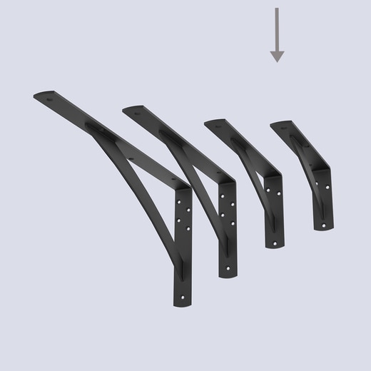 ゆるやかなRの補強がついたシンプルなブラケット。取付けの際は下地の強度、芯材の有無、天板の強度等に充分ご注意ください。
