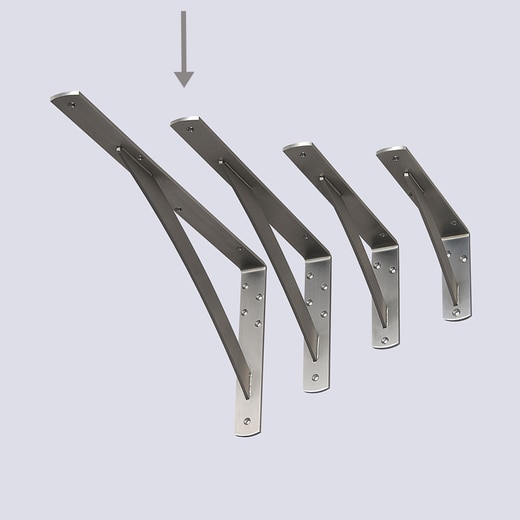 ゆるやかなRの補強がついたシンプルなブラケット。取付けの際は下地の強度、芯材の有無、天板の強度等に充分ご注意ください。