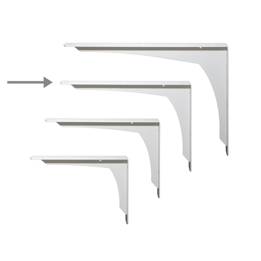 斜め補強の出っ張りが少ないスマートなデザインのL型ブラケット。取付けの際は下地の強度、芯材の有無、天板の強度等に充分ご注意ください。
