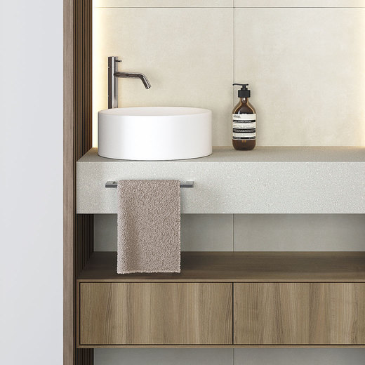 カスタムカウンター(H80,H150)に前付けできるシャープなタオルバーです。前板の板厚が15~25mm以内でしたら、造作カウンターなどでもご使用いただけます。ステンレスヘアライン仕上げです。
