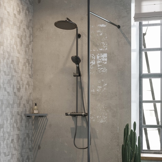 上品で合わせやすいカラー『ブラッシュドブラッククロム』は、こだわりのバスルームを上質な空間に仕上げます。オーバーヘッドシャワー&ハンドシャワー共に、空気をたっぷり含んだ“レインエア”搭載。大きなヘッドと大粒の滴は身体を柔らかく包み込んで、素早く身体を温めたりクールダウンさせます。