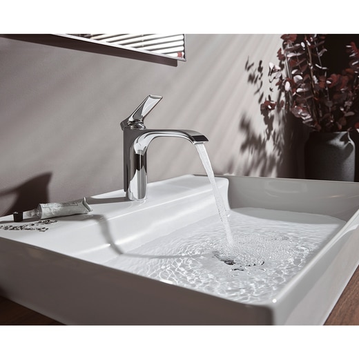 柔らかな曲線を描いたワイドなスパウトから、空気をたっぷり含んだリボンのように滑らかな水流が流れ落ちます。フラットなハンドルデザインがボディのエレガントなラインを一層際立たせます。