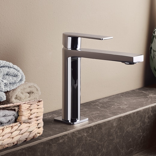 本体からスパウトへと、曲線からシャープなスクエアへと移り変わるデザインが特徴の「TANGO」シリーズ。スパウトとハンドルを平行に配置することで、クールでエレガントな印象を演出。美しさと機能性を兼ね備えた、水まわりに映える水栓です。
