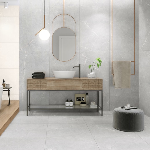 使用カラー:グラベル(右壁600-1200・床600)、ビアンコ(左壁600)