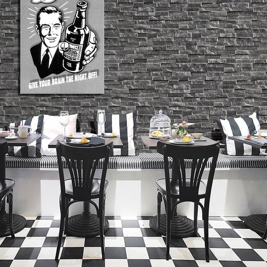 《ロックス》は、“田舎のロッジ”をイメージし、人気の高い天然石クオーツサイト(石英岩)の石目を立体的に再現した磁器質タイル。凹凸感もさまざまな53パターンもの表情を持ち、色調も豊富なので、本来のクオーツサイト以上に空間演出の可能性が広がります。また内装だけでなく外装にも使うことができ、水まわりにもOK。ブリックサイズなので、TVの後ろなどの狭いスペースにアクセントとして貼ることもできます。