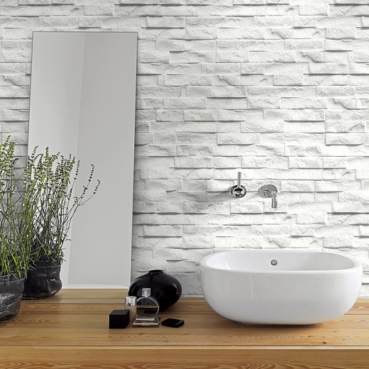 《ロックス》は、“田舎のロッジ”をイメージし、人気の高い天然石クオーツサイト(石英岩)の石目を立体的に再現した磁器質タイル。凹凸感もさまざまな53パターンもの表情を持ち、色調も豊富なので、本来のクオーツサイト以上に空間演出の可能性が広がります。また内装だけでなく外装にも使うことができ、水まわりにもOK。ブリックサイズなので、TVの後ろなどの狭いスペースにアクセントとして貼ることもできます。