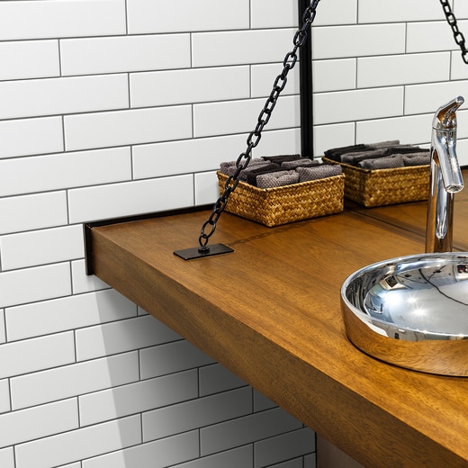 スリムな長方形で扱いやすいサイズの陶器質タイル。住宅のちょっとしたスペースから店舗まで幅広いシーンでコーディネートしやすく、ヘリンボーンなどパターン貼り施工もできます。また、カラーは定番の2色展開で、どんな空間にも調和します。