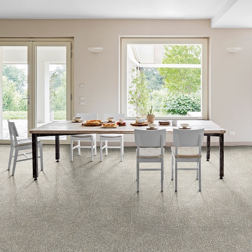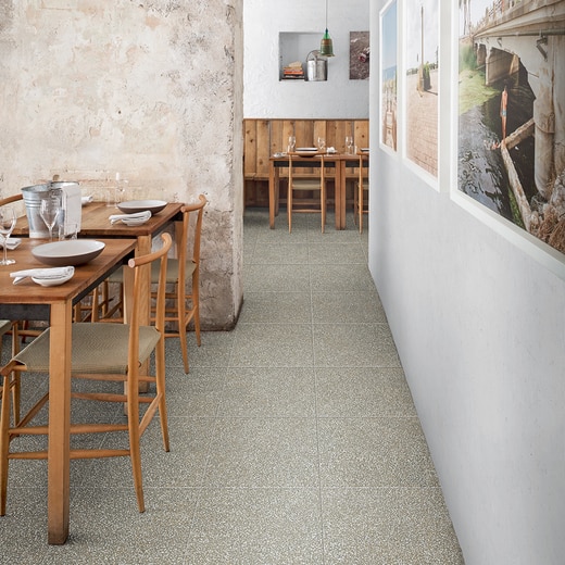 古き良き伝統的なベネチアの床に用いられていたテラゾータイルを、リプロダクトした磁器質タイルです。大理石を砕いたチップをちりばめたような、ごくわずかな色調濃淡をつけ自然にデザインしています。木目のチーク、オークの家具、メタリックの素材にも、とても合わせやすくコンテンポラリーな住宅、商業施設の外、内、床にマルチに活躍できるように作られています。伝統的な床をもっと身近に取り入れられます。