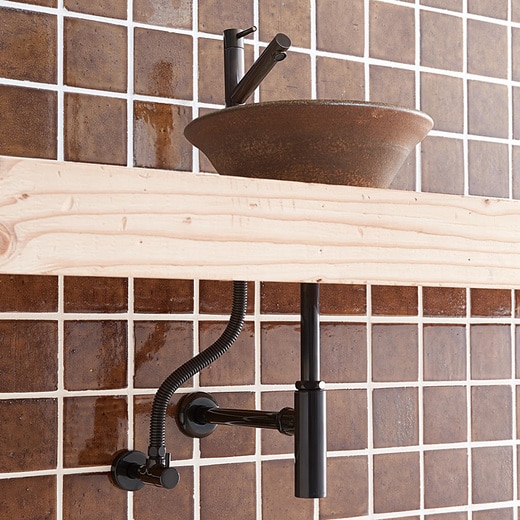 洗面ボウル『ネオス』『シガラキ』シリーズ専用の排水目皿+壁排水用ボトルトラップのセットです。これまでクロムメッキが常識と思われていた排水トラップも加飾し、細部にまでこだわって空間づくりを実現できます。ブラックの水栓と給水部材も併せてご使用頂くと統一されたワンランク上の空間に仕上がります。