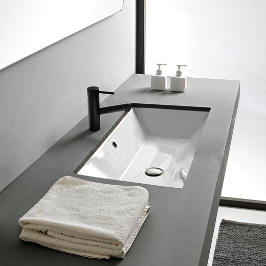 シャープなエッジとコンパクトな奥行で、小スペースでもしっかりとした洗面スペースを確保できる《テオレマ2.0》。傾斜のある縁は、軽やかな印象を与えながら水はねを抑える役割も兼ね備えています。アンダーカウンター型はすっきりとしたクールな洗面空間を実現し、カウンターのお手入れも簡単です。