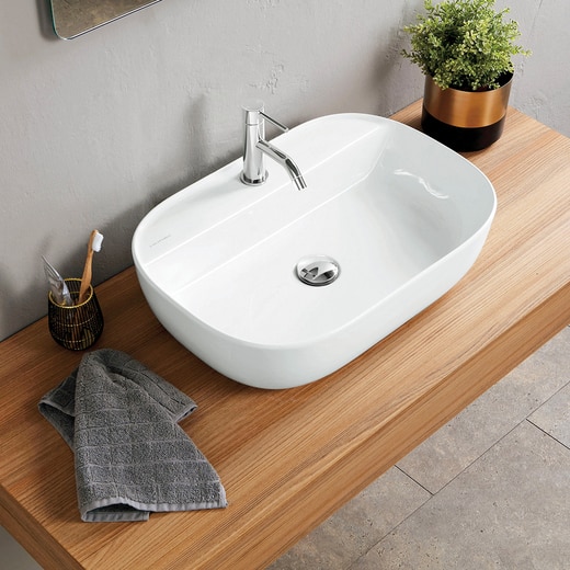 洗練されたカーブと薄い縁が印象的な《グラム》。丸くゆるやかな曲線美を持つデザインは、モダンからクラシックまで幅広い空間に調和します。使い勝手の良いサイズ感で、住宅はもちろん、ホテルや商業施設のパウダールームにもおすすめです。