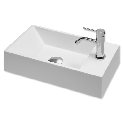 シンプルで飽きのこないコンパクトな手洗器が樹脂製で新登場。樹脂ならではのマットな質感とシャープなラインが特徴です。壁付専用 右側に水栓を固定するタイプです。本体には壁付け用の穴が開いています。