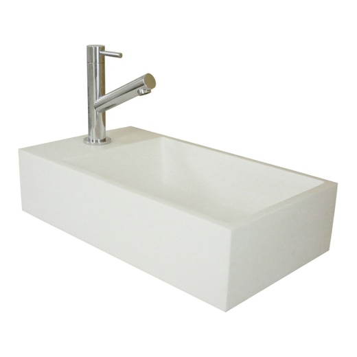 シンプルで飽きのこないコンパクトな手洗器が樹脂製で新登場。樹脂ならではのマットな質感とシャープなラインが特徴です。壁付専用 左側に水栓を固定するタイプです。本体には壁付け用の穴が開いています。