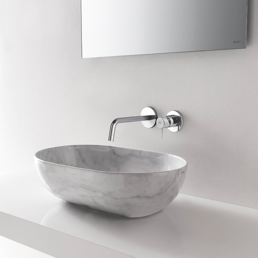 薄い縁とマットな質感が特長で、上品な印象の洗面ボウル《Tエッジ》。ル ピエトラは、独創的な大理石調カラーで、イタリアでも希少とされる天然石4種類の柄を表現しています。