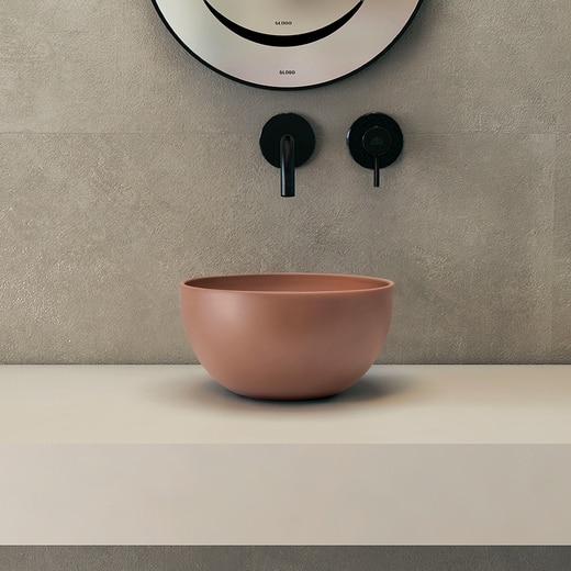 わずか6mmの薄い縁とマットな質感が、上品な印象を醸し出す《Tエッジ》。デザイン性だけでなく、汚れにくさや耐摩耗性を高めており、またバクテリアの増殖を防ぐ抗菌加工処理を施しているため清潔にお使いいただけます。狭小空間にも設置できるサイズ感で、コロンとした丸いフォルムが特長です。
