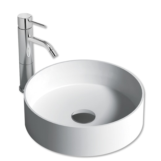 縁の薄いラウンド型に加え、つやを抑えたマットな質感にすることによって、人工大理石にモダンで軽やかな印象を添えています。