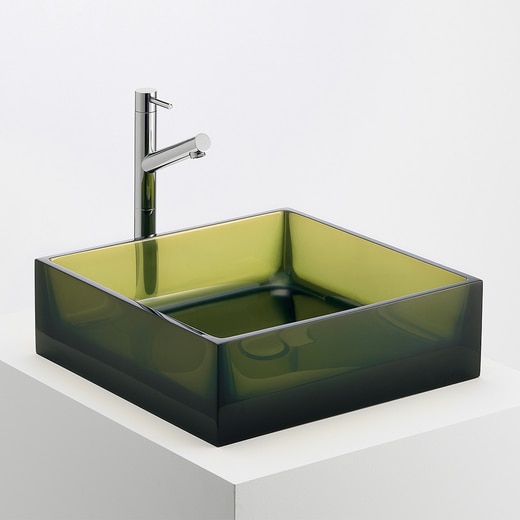 これまで国内の洗面ボウルにはなかった、割れにくいクリア素材「Cマテリアル」。美しい透明感やカラーを楽しめる、ポリエステル系の樹脂素材です。ガラスや陶器の洗面ボウルよりも割れなどを気にせず、安心してお使いいただけることもメリットです。