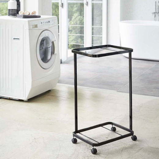 シンプルでスタイリッシュなランドリーワゴン。ランドリーワイヤーバスケットが2台置けるランドリーワゴンです。コーナーが開いたデザインになっているので、縦置き・横置きでもランドリーバスケットが取り出しやすくなっています。