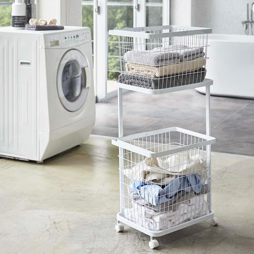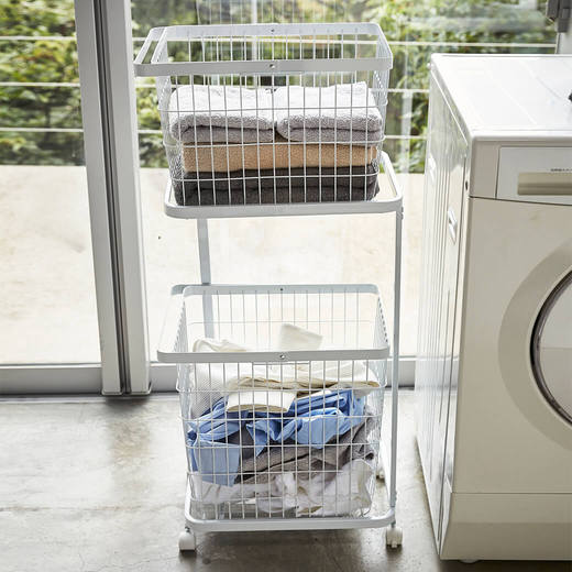 シンプルでスタイリッシュなランドリーワゴンと、ワイヤーバスケット2台のセット。コーナーが開いたデザインになっているので、縦置き・横置きでもランドリーバスケットが取り出しやすくなっています。