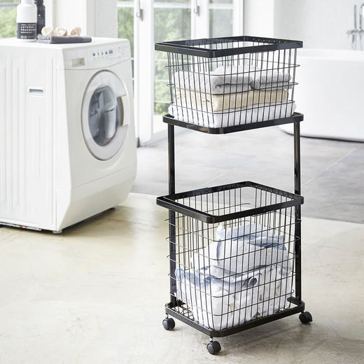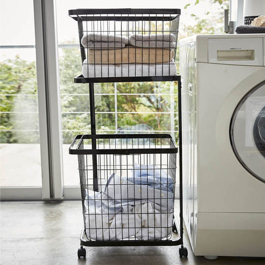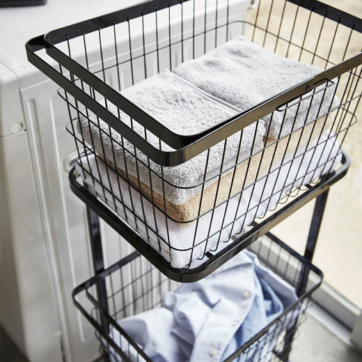 シンプルでスタイリッシュなランドリーワゴンと、ワイヤーバスケット2台のセット。コーナーが開いたデザインになっているので、縦置き・横置きでもランドリーバスケットが取り出しやすくなっています。