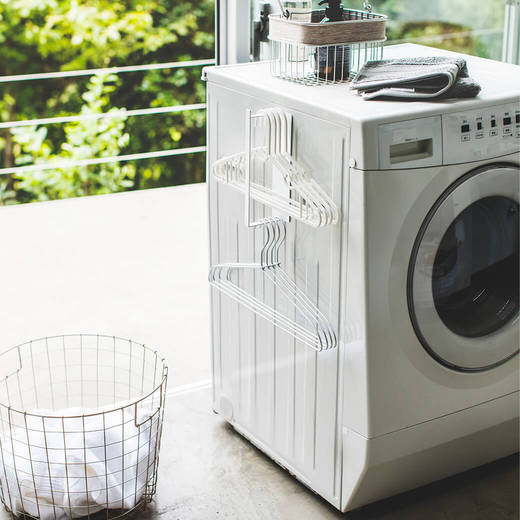 マグネットで洗濯機の側面に簡単に取り付けられるハンガー収納ラック。かさばる洗濯ハンガーをスリムに一括収納できます。洗濯機から取り出した洗濯物をその場でハンガーに掛けられるから動作がスムーズ。洗濯バサミも収納可能。横向き使用時にブラシなどを掛けられるフック3個付き。ピンチハンガー・お掃除ツールバスブーツの収納にも使えます。ランドリールームやクローゼットの壁面にも付属の木ネジで簡単に取り付けられます。