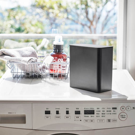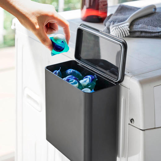 洗濯機横にマグネットで簡単取り付け可能です。洗濯洗剤ボール以外にも洗濯ネットや洗濯バサミの収納、洗濯粉末洗剤の容器として活用できます。ドラム洗濯機の上に直接置いても使用できるため、コットンや綿棒など洗面所で出るゴミを捨てるのに便利です。