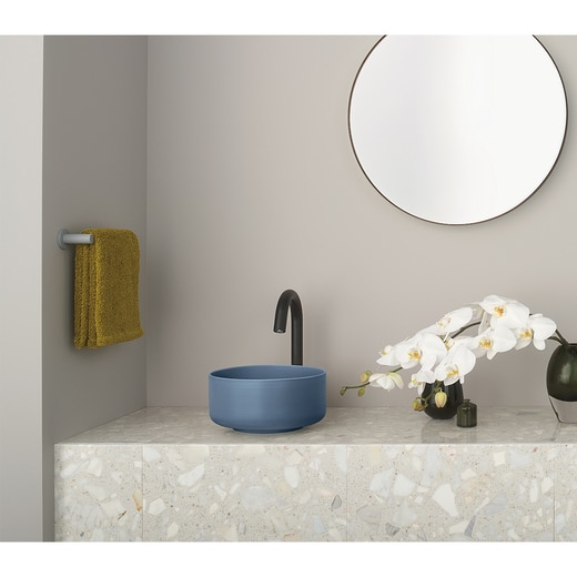 「リコロ」はインテリアのように楽しく洗面空間をコーディネートできる、業界最小クラスのカラー手洗い器です。手でそっと触れたくなるようなころんとしたサークル形状と、焼き物ならではのマットな質感を持つくすみカラーで空間に彩りと柔らかさを与えます。
