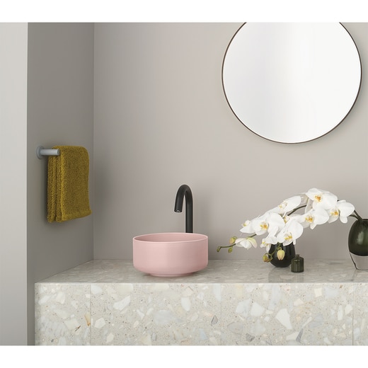「リコロ」はインテリアのように楽しく洗面空間をコーディネートできる、業界最小クラスのカラー手洗い器です。手でそっと触れたくなるようなころんとしたサークル形状と、焼き物ならではのマットな質感を持つくすみカラーで空間に彩りと柔らかさを与えます。