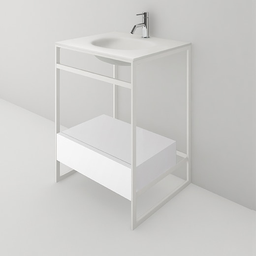 繊細で軽やかなフレームが印象的な洗面化粧台「フィーネ」。狭小空間でも圧迫感なくすっきりおさまります。また、フレーム部分は現場で組立てるノックダウン仕様ですので、搬入も容易かつ仮置きも省スペースです。