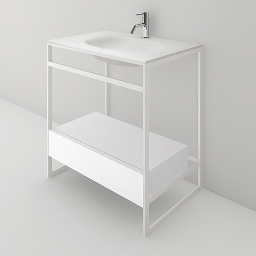 繊細で軽やかなフレームが印象的な洗面化粧台「フィーネ」。狭小空間でも圧迫感なくすっきりおさまります。また、フレーム部分は現場で組立てるノックダウン仕様ですので、搬入も容易かつ仮置きも省スペースです。