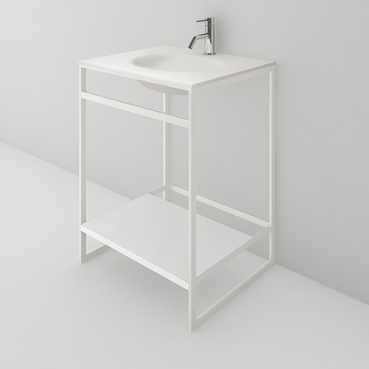 繊細で軽やかなフレームが印象的な洗面化粧台「フィーネ」。狭小空間でも圧迫感なくすっきりおさまります。また、フレーム部分は現場で組立てるノックダウン仕様ですので、搬入も容易かつ仮置きも省スペースです。