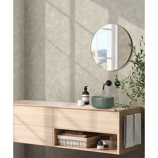 モルタルのリアルな質感を追求した、不燃内装化粧板です。薄くて軽いので、両面テープと接着剤で容易に施工ができます。キッチンなどの水回りはもちろん、リビングや寝室、マンションのエントランスや商業施設にも、壁材としてご使用いただけます。