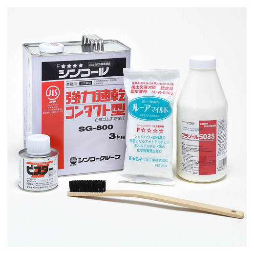 - ●施工可能数量目安:約2.6m2 ●セット内容 接着剤:Sg-800(㈱タイルメント)/3kg 金属板用防さび型接着剤:プラゾール503S(ヤヨイ化学工業㈱)/1kg 錆止め:ビスター(ヤヨイ化学工業㈱)/100g 接着剤(壁紙):ルーアマイルド(ヤヨイ化学工業㈱)/350g