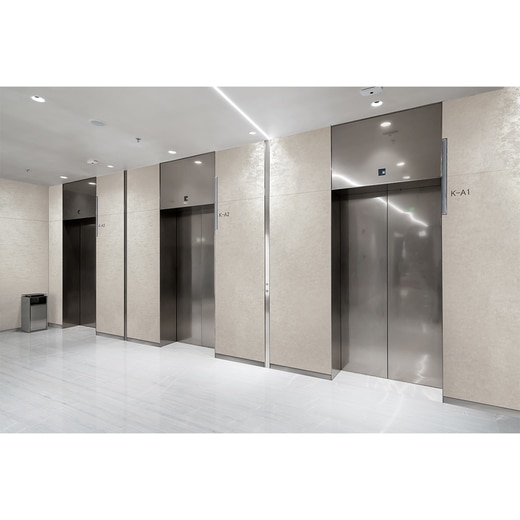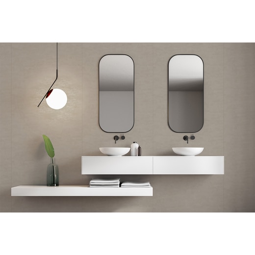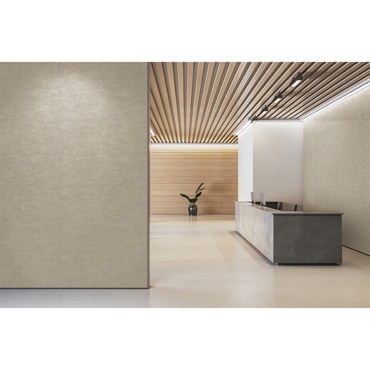 鏡面の鉄板にサンドブラストしたような質感が特徴の、不燃内装化粧板です。薄くて軽いので、両面テープと接着剤で容易に施工ができます。洗面などの水回りはもちろん、リビングや寝室、マンションのエントランスや商業施設にも、壁材としてご使用いただけます。