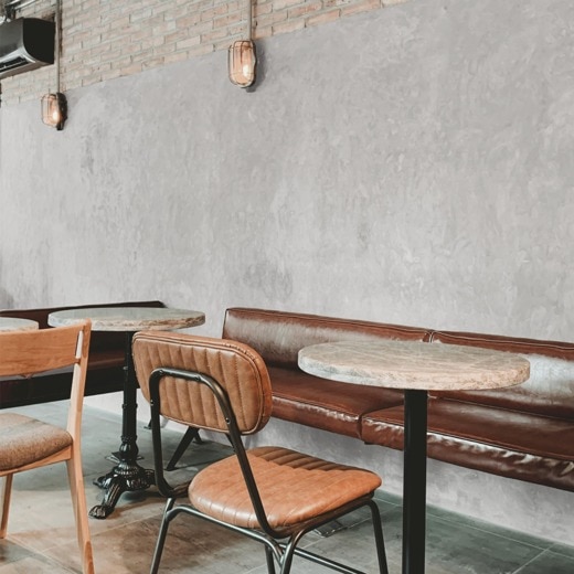 ルーセントカラーは、コンクリート・モルタルの風合いをそのままに、カラークリアで着色・浸透強化・防塵できる水性コンクリートステイン塗料です。クラックや下地のムラもそのまま仕上がりに現れるため、通常の塗料では表現できないコンクリートならではのテクスチャーをデザインできます。新築・改築を問わず様々なシーンで空間を彩ります。塗装が簡単で、1日あれば施工完了できるのも嬉しいポイント。