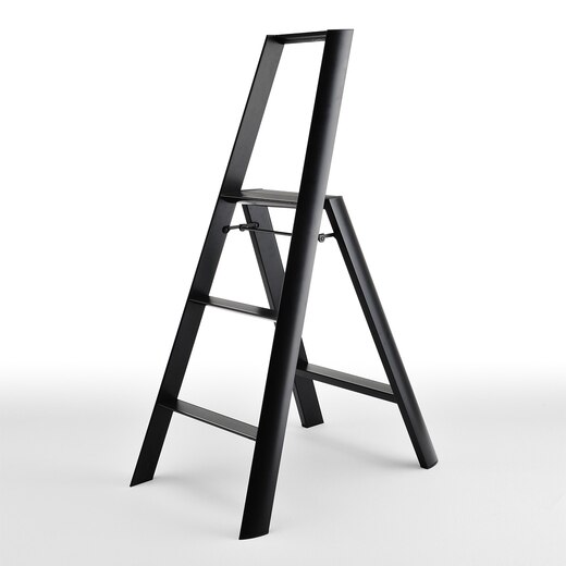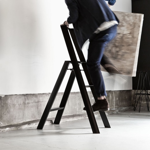 開発コンセプトは隠さなくていい脚立。インテリアと調和する、今までにない脚立が登場しました。ビスが見えない美しいデザインと機能美で、数々のデザイン賞を受賞した《ルカーノ》。持ち上げるだけで簡単に折りたためるワンタッチバーを採用しているので、安全・安心に開閉操作ができ手挟みの不安がありません。3-STEPは安全な昇り降りを支えるハンドル付き。登った際に、身体を安定させて作業ができます。