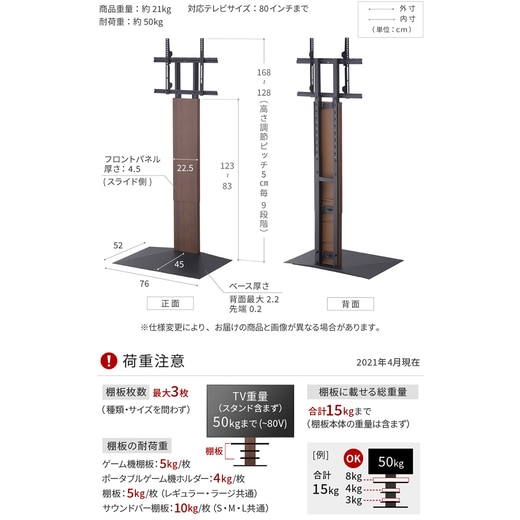 - ●材質:スチール ●仕上げ:粉体塗装 ●TV対応サイズ:32~80インチ ※必ず壁を背にして設置してください。 ※組立ては大人2人で行ってください。 【組み立てについて】 組み立て目安:大人2人で30分 用意するもの:軍手、プラスドライバー ※実際の設置場所で広いスペースを確保してから、大人2名以上で作業してください。 【注意事項】 ■普段のお手入れ ・普段のお手入れは、乾いた布で拭く程度で充分です。 ・油汚れがついた場合は、薄めた中性洗剤を浸した布で拭き、すぐに乾拭きしてください。 ・シンナー、ベンジン、漂白剤などを使用しますと、色落ちをする場合がありますので、これらの使用はお避けください。 ・定期的にボルト部分にゆるみがないかを確認し、締めなおすようにしてください。 ■ご使用に際して ・お使いの際は、壁を背にできる場所に設置してください。 ■固定棚について ・固定棚では蒸気の出る器具は使用しないでください。蒸気の当たる状態で使うと、変形・変質や家電製品の故障の原因になります。 ※商品の色柄を忠実に表現することに細心の注意を払っておりますが、お使いのパソコン環境によって、実際の色とは異なって見える場合があります。 ※品質向上の為に改良に伴い一部仕様が異なる場合があります。
