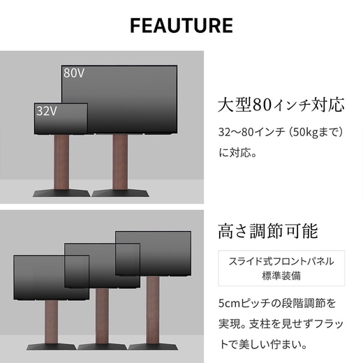 あらゆる場所をテレビのある空間に変えられる、「WALL 壁寄せテレビスタンドV3」は最大79V型の大型テレビに対応、高さ調節、背面収納などの機能面とスリムでフラットなデザイン性を両立させたWALLテレビスタンドのハイエンドモデルです。リビング、ダイニング、寝室などあらゆる場所がテレビを楽しめる空間に変わります。