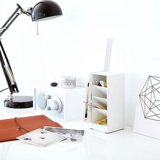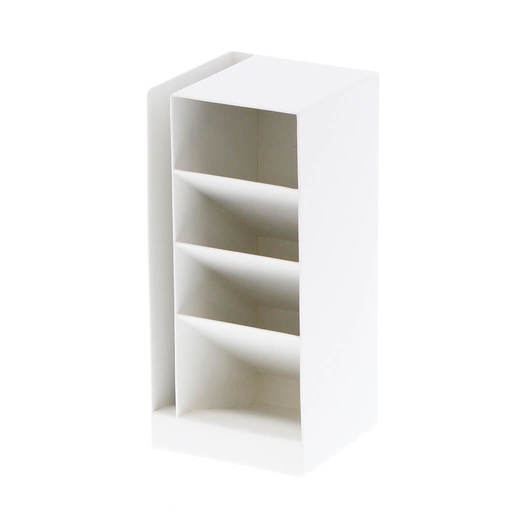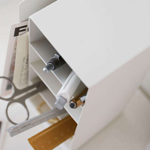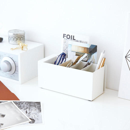 スタイリッシュなペンスタンドです。タテにもヨコにも使えるので、スペースや、収納する物に合わせた使い方ができます。横にはDMや長い定規が立てられるスペースがあり、各仕切りは斜めになっているので、ペン類が取り出しやすくなっています。