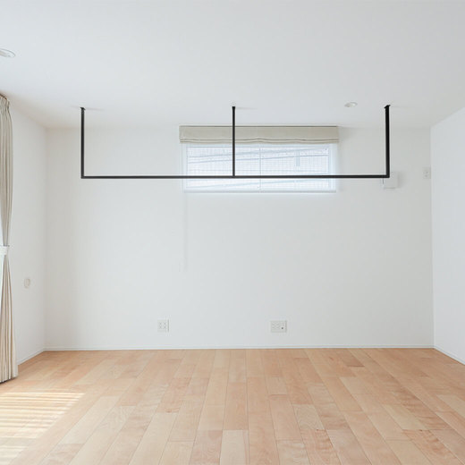 天井付け物干し「kacu」は、凹凸を極限まで無くした、シンプルな常設型物干しです。フレームに25×25mmの角パイプを採用し、フレームとフレームとのジョイント部分や壁付けブラケット部分も、凹凸を極限まで無くしたシンプルなデザインで、あらゆる部屋になじみます。