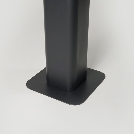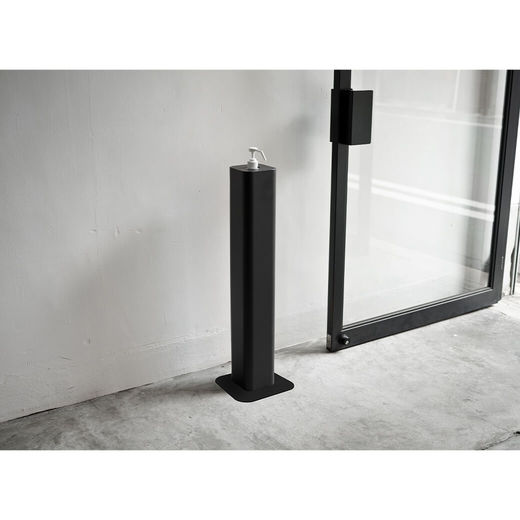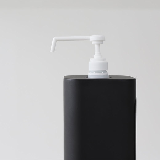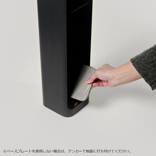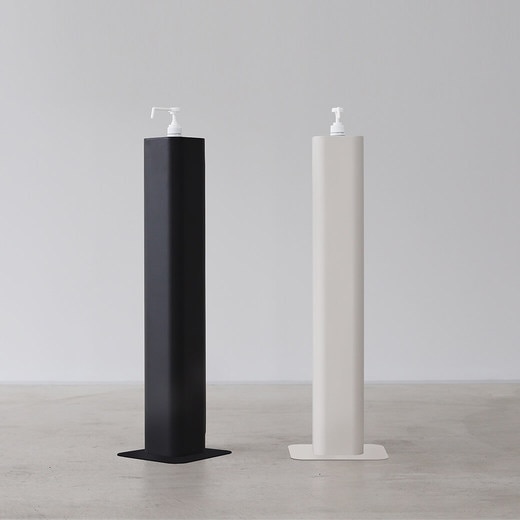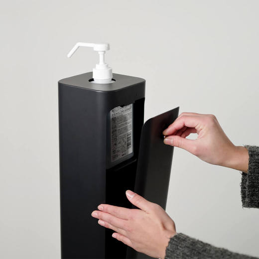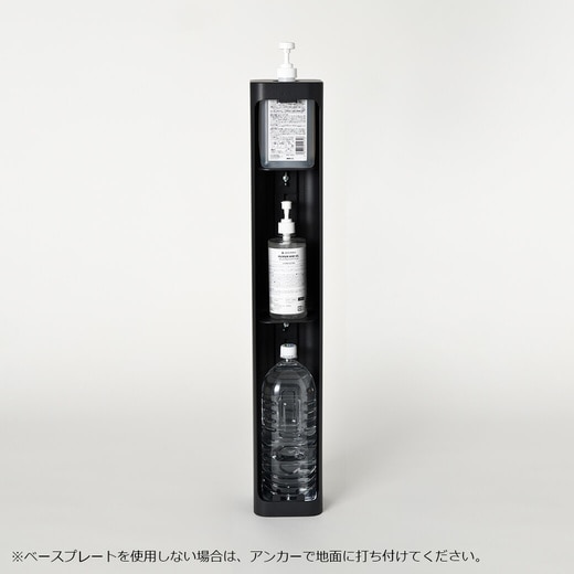 あらゆる空間の美観を邪魔しない美しい意匠のアルコールスタンドです。消毒液ボトル本体を隠せる他、可動式棚で予備をストックする事ができます。付属のおもりとベースプレートが転倒防止になります。また、ベースプレートを使用せずアンカーで地面に打ち付けると、よりすっきりとした佇まいになります。※消毒液ボトルは別途ご準備ください。使いやすさの点からロングノズルのボトルを推奨しています。