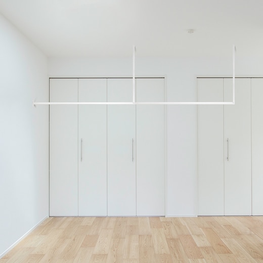 天井付け物干し「kacu」は、凹凸を極限まで無くした、シンプルな常設型物干しです。フレームに25×25mmの角パイプを採用し、フレームとフレームとのジョイント部分や壁付けブラケット部分も、凹凸を極限まで無くしたシンプルなデザインで、あらゆる部屋になじみます。