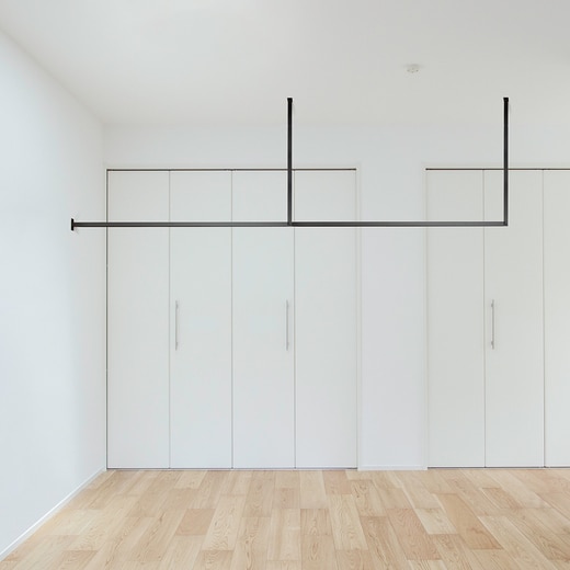 天井付け物干し「kacu」は、凹凸を極限まで無くした、シンプルな常設型物干しです。フレームに25×25mmの角パイプを採用し、フレームとフレームとのジョイント部分や壁付けブラケット部分も、凹凸を極限まで無くしたシンプルなデザインで、あらゆる部屋になじみます。