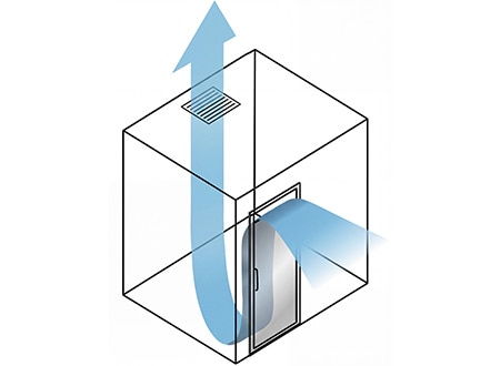 浴室内の換気扇を運転した場合のみ、フラップが開く構造。入った空気は下に流れてから上に向かい、湿気を効率的に排出します。