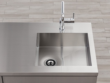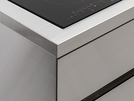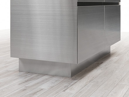 本体のコーナー部は留め加工によって美しい納まりを追求。引き出し上部も手をかけやすい形状にして取手をなくし、シンプルデザインを徹底しました。さらに、ステンレスを研磨することで髪のように細かな筋をあらわしたヘアライン仕上げにより、直線的なデザインを強調。表面仕上げは、ランダムな研磨模様をほどこすことでやわらかな印象を与えるバイブレーション仕上げもオプションでお選びいただけます。いずれもオールステンレス(※)なので清潔にお使いいただけます。