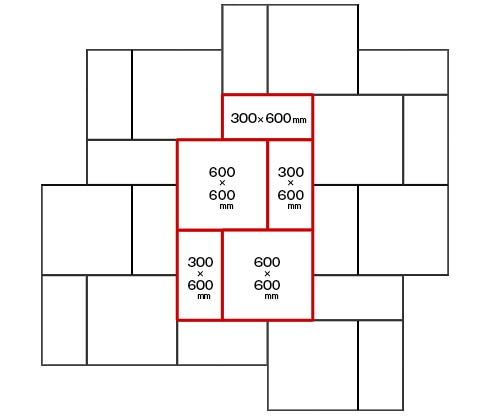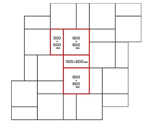 ※600×600×10mmは36パターン、600×300×10mmは72パターンの色差・柄があり、ランダムに封入されています。