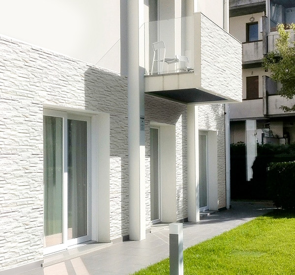 近年、天然石のクオーツサイト(石英岩)が室内の壁にも多く使われるようになっています。《ロックス》は、そんなクオーツサイトの石目を、磁器質タイルで忠実に再現。立体的なデザインにより、クオーツサイトのエレガントさとともにタフなイメージも持たせています。内装だけでなく外装にもお使いいただけるので、室内外の連動感も表現できます。